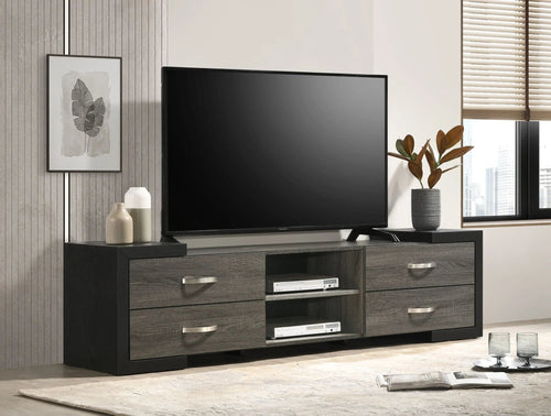 Discover the epitome of modern elegance with this stylish entertainment console, a perfect blend of contemporary design and functionality. Crafted with sleek, dark tones and complemented by bold black accents, this console exudes a sophisticated charm that effortlessly enhances any living space. The spacious surface accommodates your large flat-screen TV while the four roomy drawers provide ample storage for all your media essentials, ensuring a clutter-free environment. Central open shelves are perfect for displaying your favorite decor pieces or housing your gaming consoles and media players. Finished with brushed metal handles for a touch of industrial flair, this entertainment console is not just a piece of furniture—it's a statement of refined taste and practical luxury.