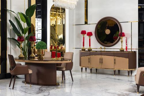 The Channel Dining Room Set offers a cohesive blend of luxury and expert craftsmanship, designed to elevate your dining experience. Featuring a beautifully crafted table and matching chairs, each piece showcases premium materials and refined details that ensure both durability and timeless elegance. This set creates a sophisticated atmosphere, perfect for formal gatherings or everyday indulgence.