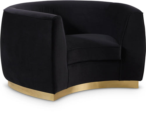 The perfect mix of velvet and stainless steel comes to life in your space with this Julian Chair. This bold velvet chair comes upholstered in rich, sumptuous-to-the-touch velvet to make a fashionable statement in your space. The curved back design lends it a modish touch, and the stainless steel trim around its base adds to its glitzy appeal. Stage this chair alone or with other pieces in the Julian collection.
