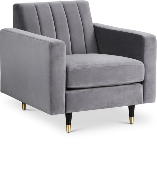 Cozy up to the comfort of this Lola Chair. Its rich color adds a jolt of excitement and fun to your space, shaking things up in a neutral-colored room. The back is channel tufted for a beautiful, contemporary look and to help the back cushioning maintain its welcoming loft. Elegant slant-tipped legs with tips lend this chair a charmingly modern finish and provide a sturdy foundation. Add it on its own, or add the matching sofa and loveseat for a coordinated look.