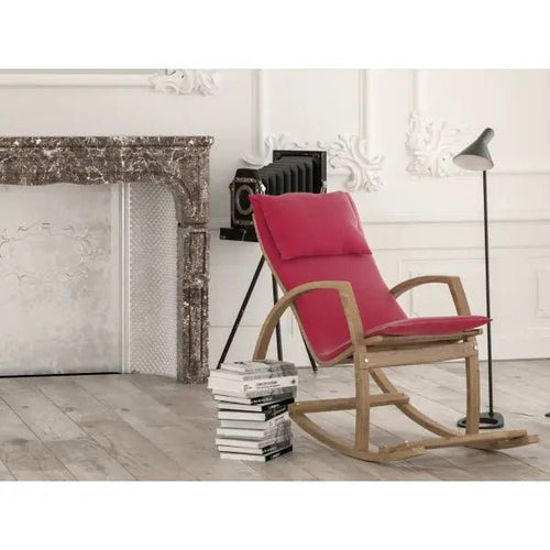Add a pop of color to your living room with this vibrant red rocking chair. Made of durable wood with a comfortable cushioned seat, this chair is perfect for relaxing and rocking away your stress.