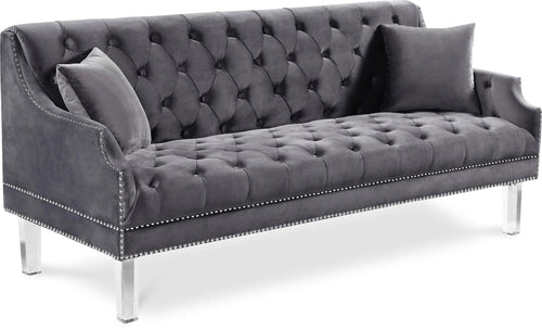 Bring a posh look home with this Roxy Sofa. The velvet is both striking yet unobtrusive, giving your room an elegant style boost while providing you with a comfortable spot to sit and relax while reading or watching TV. Deep button tufting gives the sofa a touch of texture while ensuring its sophistication is lost on no one. Add this contemporary sofa on its own to your living room or den, or buy it alongside the coordinating loveseat and chair for a complete and total makeover.